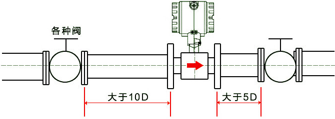 1、對直管段的要求:必須水平安裝在管道上(管道傾斜在5以內(nèi)),安裝時流量計軸線應與管道軸線同心,流向要一致。上游管道長度應有不小于2D的等徑直管段,如果安裝場所充許建議上游直管段為20D、下游為5D。