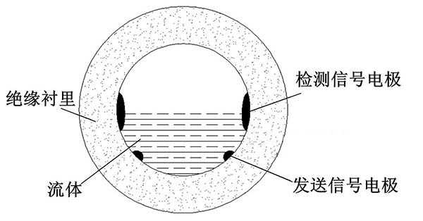 ①多電*式非滿管冷卻塔冷卻水流量計(jì)。其底部是一對(duì)信號(hào)注人電*,中間有多對(duì)測(cè)量電*,頂端有一個(gè)滿管電*。在滿管情況下,該流量計(jì)與普通的冷卻塔冷卻水流量計(jì)的功能相同,滿管情況下流體的橫截面積是固定的,此時(shí)計(jì)算流量值只需要測(cè)量流體的流速即可。當(dāng)流體非滿管時(shí),滿管電*檢測(cè)到管道非滿狀態(tài),利用算法修正測(cè)量值,此時(shí)流量計(jì)的測(cè)量方式改成測(cè)量流體流速和液面高度。信號(hào)注人電*與在不同位置的三對(duì)測(cè)量電*共同工作,用于測(cè)量液位面的高度和流體的速度。多電*式非滿管冷卻塔冷卻水流量計(jì)結(jié)構(gòu)簡(jiǎn)圖如圖3所示。