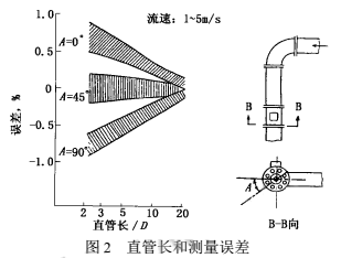 2000年上海原水公司擬在已建成的某泵站加裝DN2200稀硝酸流量計(jì),但彎管下游安裝位置的前直管長度明顯不符合規(guī)定中5D~10D(D為管徑,下同)的要求,此時,影響測量誤差有多大呢?