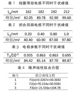 仿真試驗(yàn)中,設(shè)定線圈等效電感取值范圍為 162~212mH,間隔 10mH;閉合回路等效電感范圍 0.2~1mH,間隔為 0.2mH;雙電層電容、接觸電阻隨流體電導(dǎo)率變化而變化,電導(dǎo)率增大接觸電阻和雙電層電容減小而電荷傳遞電阻增大??稍O(shè)定電*接觸電阻、雙電層電容和電荷傳遞電阻范圍分別為 5~15kΩ、10~20μF 和50~60Ω,由公式(7)知,可用 T2 表示上述三者關(guān)系。 仿真參數(shù)取值不同情況下,通過 MATLAB 工具箱對仿真測量得到的干擾峰值進(jìn)行曲線擬合畫出相應(yīng)的曲線圖。 其中仿真數(shù)據(jù)和相對應(yīng)的曲線方程如表 1~表 4 所示,曲線圖如圖 4~圖 6。