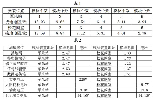 接地網的安裝與連接:接地網是整個重油流量計防雷試驗比較關鍵的一個內容,能不能準確的論證試驗的有效性,必須保證接地網達到標準的接地電阻,通過對實地地電阻率的測試,初步選擇6個接地模塊埋設并配用降阻劑使用,邊安裝邊測試直到達到標準值后才引入等電位箱。在軍樂站和松花閥室安裝模塊并測試數據見表1。