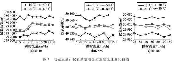 將實(shí)驗(yàn)測(cè)得的環(huán)保污水專用流量計(jì)在不同溫度及流速下的儀表系數(shù)數(shù)據(jù)整理,特性曲線如圖1所示,3組曲線分別對(duì)應(yīng)DN40、DN80、DN100的3塊環(huán)保污水專用流量計(jì)的儀表系數(shù)曲線。