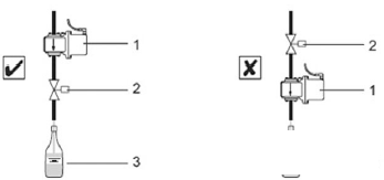 4.2.2 安裝位置。安裝在閥門附近,灌裝流量計(jì)不能安裝在控制閥的下游(圖6),如果裝在控制閥的下游,在一個(gè)灌裝周期結(jié)束后,傳感器的測量管道完全排空,這樣會嚴(yán)重影響下個(gè)周期的測量。