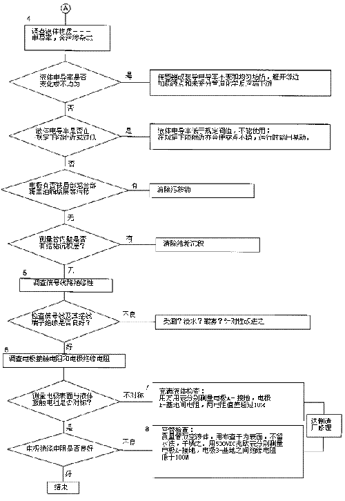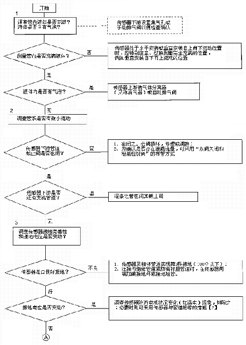 檢查流程圖*5項。信號回路絕緣下降會形成零點(diǎn)不穩(wěn)。信號回路絕緣下降的土要原因足,包*部位絕緣下降所引起的,但也不能排除信號電纜及其接線端子絕緣下降或破壞。因?yàn)橛袝r候現(xiàn)場環(huán)境十分嚴(yán)酷,稍一疏忽儀表蓋、導(dǎo)線連接處密封不慎,彌漫著潮氣酸霧或粉粒塵埃侵入儀表接線盒或電纜保護(hù)層,使絕緣卜降。信號回路絕緣電阻檢查分別按電纜側(cè)和流量傳感器側(cè)兩郵分進(jìn)行,用兆歐表測試。因信號電纜容易可先做。流量傳感器再分兩次進(jìn)行:充滿液體測黽電*表面接觸電阻和個管后測量,U*絕緣電阻。