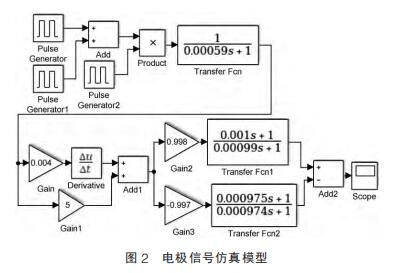 本文基于 Matlab 中 Siumlink 對(duì)電*信號(hào)進(jìn)行仿真,勵(lì)磁方式為三值波勵(lì)磁,勵(lì)磁頻率 f=25Hz,傳感器參數(shù) D=40mm、Rx=88.8Ω、Lx=162mH,勵(lì)磁系統(tǒng)參數(shù) Ue=100V、穩(wěn)態(tài)電流 I0=200mA。基于電*測(cè)量回路搭建的仿真模型如圖 2 所示,圖中信號(hào)模塊 pulsGenerator 通過加法器、乘法器得到勵(lì)磁電流。由公式(1),在固定流速下感應(yīng)電勢(shì)與勵(lì)磁電流成正比,通過增加 Gain1 模塊得到感應(yīng)電勢(shì)信號(hào)。 對(duì)勵(lì)磁電流進(jìn)行求導(dǎo)即經(jīng)模塊 Derivative 得到微分噪聲, 其中 Gain 值與 Lx 和 L1 相關(guān)。 感應(yīng)電勢(shì)與噪聲經(jīng)Add1 疊加之后得到電*信號(hào) E1(t)。 scope 觀察輸出信號(hào)波形。仿真波形和真實(shí)波形如圖 3 所示。 將傳感器參數(shù)代入到勵(lì)磁電流穩(wěn)態(tài)調(diào)節(jié)時(shí)間公式中,得電流上升時(shí)間為 360μs,測(cè)得實(shí)際上升時(shí)間為 390μs,兩者相差不大,驗(yàn)證了仿真模型的正確性。
