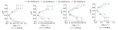 由圖5可知,當(dāng)e相同時(shí),斷面*小流速發(fā)生的位置相同,發(fā)生在浮體結(jié)構(gòu)下游回流區(qū)位置。隨著來流流量的增大,流經(jīng)浮體結(jié)構(gòu)下泄的水流流速在上層和下層水體中呈現(xiàn)增大的趨勢。浮體結(jié)構(gòu)位置不變,由于受到浮體結(jié)構(gòu)的擠壓,上游來流分別經(jīng)過浮體結(jié)構(gòu)上部、下部進(jìn)行泄流,因此在下游區(qū)域的上層、下層水體中,流速較大;受浮體結(jié)構(gòu)的阻擋,浮體結(jié)構(gòu)下游區(qū)域形成回流區(qū),流速較小。試驗(yàn)過程中,由于控制浮體結(jié)構(gòu)所在水域的上游、下游水位不發(fā)生變化,因此隨著來流流量的增大,流速呈現(xiàn)增大的趨勢。