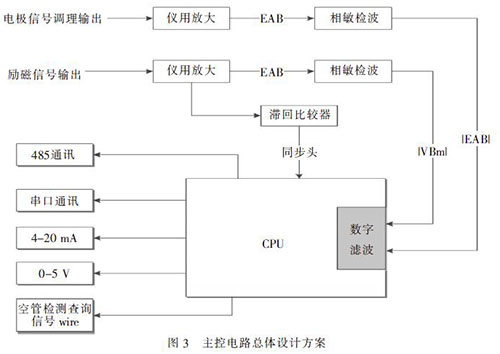 電*檢測(cè)出的微弱感應(yīng)電動(dòng)勢(shì)E, 先經(jīng)前置放大器的放大和噪聲抑制而成為大幅度低阻抗的電壓信號(hào)。此信號(hào)經(jīng)相敏檢波后,給CPU 進(jìn)行數(shù)字濾波、處理和控制,通過(guò)利用雙線性變換法將模擬的二階巴特沃斯低通濾波器轉(zhuǎn)換為數(shù)字式濾波器,既簡(jiǎn)化電路設(shè)計(jì),且可靠性高、穩(wěn)定性好。通過(guò)編寫軟件CPU 能對(duì)放大器的溫度漂移及零點(diǎn)漂移給予補(bǔ)償, 并在測(cè)量的全量程范圍內(nèi)分10 段對(duì)信號(hào)進(jìn)行非線性修正,使得測(cè)量值更好地?cái)M合真實(shí)數(shù)據(jù)??展軝z測(cè)電路上,CPU 作為從控制器。當(dāng)主控制電路上發(fā)出空管檢測(cè)查詢信號(hào)wire, 從控制器進(jìn)行識(shí)別后接收并判斷出查詢什么信號(hào),然后產(chǎn)生應(yīng)答信號(hào)上傳至主控芯片輸出顯示;當(dāng)檢測(cè)為空管信號(hào)時(shí), 從CPU 發(fā)出的zero 信號(hào)通過(guò)控制MOS 管開關(guān)來(lái)關(guān)斷流速輸出。在應(yīng)用中,對(duì)于微弱信號(hào)的放大及提取還需注意PCB 板設(shè)計(jì)時(shí)EMI 電磁屏蔽考慮,屏蔽來(lái)自空間磁場(chǎng)的干擾、周邊設(shè)備的輻射造成的干擾和板內(nèi)之間的干擾,如數(shù)模分離、強(qiáng)弱電分離等等。