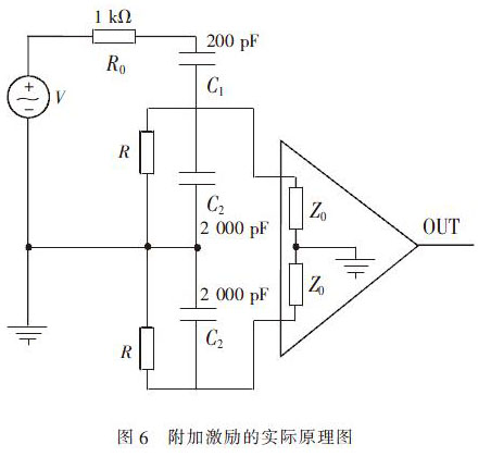 如圖6 所示為附加激勵(lì)的實(shí)際原理圖。其中R是流體電阻,C1是激勵(lì)源與傳感器電*及其放大器輸入的隔直電容,C2是信號(hào)電纜的對(duì)地電容。