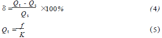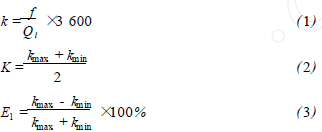 將乙烯流量計在標準水裝置上,分別用頻譜分析和脈沖計數(shù)的方法進行標定,流體介質(zhì)為水未加氣體,采用的標準傳感器為精度等級為0.2級的電磁流量計。在每個流量測量點上的儀表系數(shù)用公式(1)計算,然后用式(2)計算得到*終儀表系數(shù)K。Ql為被測水的流量值,f為每一個流量點得到的頻率,k為每個測量點得到的儀表系數(shù)。kmax、kmin分別為試驗流量范圍內(nèi)得到的*大與*小的儀表系數(shù)。儀表系數(shù)的線性度E1用式(3)來計算。