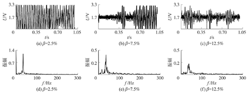 試驗發(fā)現(xiàn),氣相的加入對乙烯流量計測量的影響顯著,譜分析和脈沖計數(shù)兩種方法隨著氣相注入的增加其表現(xiàn)也不同。圖4反映了水流量12m3/h時,注入不同氣含率β時A點的模擬信號,如圖4(a~c)所示;經(jīng)譜分析后得到的頻率值,如圖4(d~f)所示;用脈沖計數(shù)方法得到的脈沖信號,如圖4(g~i)所示。圖4顯示,當注入氣量不大時,對乙烯流量計的影響不大,無論是譜分析結(jié)果還是脈沖計數(shù)得到的結(jié)果都比較好。當注入的氣量進一步增加時,渦街原始信號強度和穩(wěn)定性逐漸變差,渦街頻率信號會被干擾信號所淹沒,反映到譜分析圖是,渦街頻率的譜能量減小,干擾信號的譜能量加強;對于脈沖信號,會因為一些旋渦信號減弱,形成脈沖缺失現(xiàn)象,而不能真實地反映渦街產(chǎn)生的頻率。