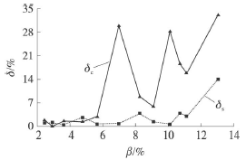 將試驗數(shù)據(jù)進行處理,得到了乙烯流量計測量誤差隨氣相含率變化的情況,如圖5所示。其中δs為譜分析方法的測量誤差,δc為脈沖計數(shù)方法的測量誤差。乙烯流量計的測量誤差用式(4)來計算。其中Qs為裝置中標準表測量出的管道總流量,Qt為試驗管段中乙烯流量計的測量值。將譜分析和脈沖計數(shù)得到的頻率值和儀表系數(shù)分別代入式(5)計算Qt值。從圖中可以看出氣相含率的增加兩種測量方法得到的誤差并不相同。當含氣率不高時,0<β<6%,譜分析法的平均誤差為1.226%,*大誤差為2.687%,脈沖計數(shù)法的平均誤差為1.583%,*大誤差為2.898%,因此譜分析法與脈沖計數(shù)法的測量誤差區(qū)別不大,譜分析沒有明顯的優(yōu)勢;在氣相含率進一步增加時,6%<β<14%,譜分析法的平均誤差為3.975%,*大誤差為14.058%,脈沖計數(shù)法的平均誤差為20.053%,*大誤差為33.130%,脈沖計數(shù)的方法得到的測量誤差遠大于譜分析方法。