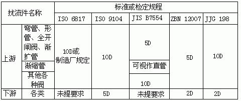 為獲得正常測量精確度,電磁流量傳感器上游也要有一定長度直管段,但其長度與大部分其它流量儀表相比要求較低。90°彎管、T形管、同心異徑管、全開閘閥后通常認為只要離電*中心線(不是傳感器進口端連接面)5倍直徑(5D)長度的直管段,不同開度的閥則需10D;下游直管段為(2~3)D或無要求;但要防止蝶閥閥片伸入到傳感器測量管內(nèi)。各標(biāo)準(zhǔn)或檢定規(guī)程所提出上下游直管段長度亦不一致,匯集如表1所示,要求比通常要求高,這是由于為保證達到當(dāng)前0.5級精度儀表的要求。表1