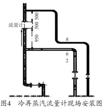 根據(jù)圖1渦街流量安裝要求示意圖及廠家的設(shè)備說(shuō)明書(shū)要求,流量計(jì)上游的直管段長(zhǎng)度至少為20D≈1 300mm,下游的直管段至少在5D≈325mm,D=65mm 為管道直徑。圖4為冷再蒸汽流量計(jì)現(xiàn)場(chǎng)安裝圖,流量計(jì)上游僅為950mm<1600mm,此流量計(jì)安裝位置有誤,對(duì)測(cè)量值有一定的影響,造成測(cè)量偏差,需調(diào)整流量計(jì)的安裝位置。