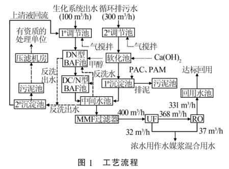 2種廢水在中間水池混勻后,通過泵提升進(jìn)入保安過濾器,進(jìn)一步去除細(xì)小的懸浮物后經(jīng)過增壓泵進(jìn)入超濾膜(UF)處理系統(tǒng)和反滲透(RO)系統(tǒng),然后通過管道式電磁流量計進(jìn)行計量。反滲透出水直接進(jìn)入回用水池達(dá)標(biāo)回用,超濾濃水以及反滲透濃水用作水煤漿混合用水。污泥池中的污泥通過泵打入帶式機(jī)壓濾處理,濾液自流進(jìn)入1#調(diào)節(jié)池。工藝流程見圖1。