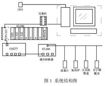 集氣站是收集氣井所生產(chǎn)天然氣的站場,在集氣站內(nèi)對(duì)天然氣進(jìn)行節(jié)流降壓、加熱、調(diào)壓計(jì)量等各種工藝預(yù)處理,設(shè)備眾多且分散。為方便進(jìn)行檢測(cè)和操作,必須進(jìn)行統(tǒng)一的數(shù)據(jù)采集,在監(jiān)控臺(tái)進(jìn)行數(shù)據(jù)的管理。集氣站設(shè)備主要包括加熱爐、高壓型電磁流量計(jì)、分子篩、火災(zāi)報(bào)警盤,以及供電設(shè)備 UPS 等,這些不同廠家的設(shè)備基本都支持Modbus 協(xié)議,通過 Modbus 通訊可以將這些數(shù)據(jù)采集。為了有效降低成本,設(shè)計(jì)了如圖 1 所示的系統(tǒng)。系統(tǒng)采用西門子 S7-300 控制器,通過以太網(wǎng)連接上位機(jī)監(jiān)控軟件,再通過 MP277 連接S7-200 的方式。S7-200 控制器自帶 RS485 接口,能夠進(jìn)行 Modbus 通訊,采集現(xiàn)場各種設(shè)備數(shù)據(jù)。*后通過以太網(wǎng)通訊將設(shè)備數(shù)據(jù)上傳至監(jiān)控軟件,方便操作人員進(jìn)行監(jiān)控,該方案簡單有效,能夠?qū)崿F(xiàn)集氣站內(nèi)設(shè)備的狀態(tài)監(jiān)控,數(shù)據(jù)處理,有效的進(jìn)行天然氣的生產(chǎn)工作。
