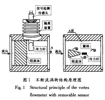 不斷流渦街同樣是以卡門渦街原理為依據(jù)測量流體流速的,但不斷流渦街表體已經(jīng)在結(jié)構(gòu)上有了質(zhì)的改變。如圖1所示,它將普通渦街單一的信號檢測傳感頭改變?yōu)閭髁U與信號檢測傳感頭兩部分,并通過隔離裝置完全隔離。當(dāng)表體中流過流體并產(chǎn)生漩渦時,由傳力桿檢測漩渦的變化,并以力的形式傳遞給信號檢測傳感頭,完成了力信號到電信號的轉(zhuǎn)換過程。雖然傳力桿與流體直接接觸,但其本身只是進行力傳輸?shù)母軛U,因此,只對外形尺寸及鋼材選擇上具有要求。而信號檢測傳感頭是通過隔離裝置與流體完全密閉隔離的,再加上隔離裝置本身具有的散熱功能,使得信號檢測傳感頭的使用溫度要遠(yuǎn)遠(yuǎn)低于流體的實際溫度,從而有效地提高了普通信號檢測傳感頭的可測介質(zhì)溫度。同時,不斷流渦街在進行維修更換信號檢測傳感頭時,并不影響工藝管道內(nèi)流體的流動,真正實現(xiàn)了信號檢測傳感頭的不斷流拆裝維護。