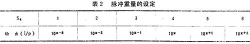 脈沖重量設(shè)定用S4插頭選擇進行,它的設(shè)定有一定的條件,這些條件是脈沖輸出的類型、脈沖寬度和刻定常數(shù)。并且它的選擇范圍還要依據(jù)脈沖寬度和*大測量流量-口-口口-l0的X方(m3/h)來確定。其系數(shù)-(數(shù)字同*大流量m3/h)由*大流量的前三位有效數(shù)定決定,而對應(yīng)于“x”值的脈沖重量(l/p)見表2。