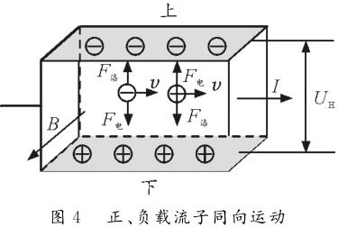 情形2:正、負載流子反向運動。如圖3所示,長方體玻璃水槽中盛有NaCl的水溶液,水槽左、右側壁內(nèi)側各裝一導體片,在溶液中通入水平向右的電流,勻強磁場B垂直紙面向外。NaCl溶液中既有正離子,又有負離子,根據(jù)左手定則可判斷正離子受到向下的洛倫茲力,故向下運動并堆積。同理,負離子也受到指向下的洛倫茲力,也向下運動并堆積。由于正負離子均向下側面堆積,故上下兩側面的電勢均為零,但下側面處離子濃度大于上側面離子濃度。