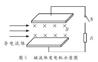 【例1】圖5為磁流體發(fā)電機示意圖。設兩金屬板間的距離為d,兩*板間勻強磁場的磁感應強度為B。等離子體垂直進入磁場的速度為v,單個離子所帶的電荷量為q。離子通道(即兩*板內(nèi)所圍成的空間)的等效電阻為r,負載電阻為R。則下列判斷正確的是( ?。?br /> A。該發(fā)電機的電動勢E=Bdv