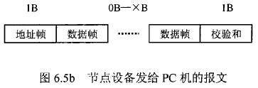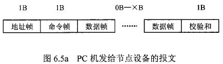 在花生油流量計等節(jié)點(diǎn)設(shè)備和C機(jī)通信的過程中,由地址幀、命令幀、數(shù)據(jù)幀、校驗(yàn)和可組成各種功能不同的報文。由于采用主從工作方式來實(shí)現(xiàn)通信,花生油流量計等節(jié)點(diǎn)設(shè)備僅能接收并執(zhí)行PC機(jī)發(fā)送來的控制命令,而不能發(fā)送命令給PC機(jī)。因此,由PC機(jī)發(fā)往流量計等節(jié)點(diǎn)設(shè)備的報文一般包括一個地址幀,一個命令幀,若干個數(shù)據(jù)幀和一個校驗(yàn)和,其報文格式圖.6a5所示;而由流量計等節(jié)點(diǎn)設(shè)備發(fā)往PC機(jī)的報文一般包括一個地址幀,若干個數(shù)據(jù)幀和一個校驗(yàn)和,其報文格式如圖6.5b所示。