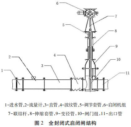 包括進水管、直管、出水管、一氧化碳流量計組和啟閉機組,進水管、直管、出水管從左到右依次連接,一氧化碳流量計組安裝在直管和出水管之間且位于出水管的入口處,一氧化碳流量計組通過聯(lián)結桿與啟閉機組的輸出端連接。為防止泥沙淤積影響啟閉,一氧化碳流量計采用閘板式啟閉結構。密封式啟閉閘為整體封閉管道式,全部采用不銹鋼材料,水流通過管道流出讓整個閘井內(nèi)干燥無水。伸縮套管與波紋管的設計讓檢修與清理淤泥更加方便。一氧化碳流量計裝有荷載限制器,其布置受力明確、結構緊湊、動作可靠。當?shù)蹙呱系暮奢d達到額定值的 110%時,或電機電流超過額定電流 150%時,系統(tǒng)自動切斷操作電源以保護設備安全。