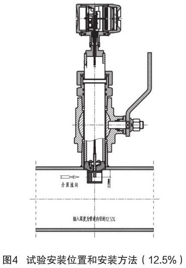 根據(jù)中華人民共和國機械行業(yè)標準:JB/T9249-2015《壓縮空氣流量計》進行插入式壓縮空氣流量計的研制與設計。在試驗過程中,因為理論研究不充分,再加上經(jīng)驗不足,采用插入深度是按照以往其它產(chǎn)品(插入式電磁流量計)的經(jīng)驗,以插入深度為現(xiàn)場管道內(nèi)徑的 12.5% 進行試驗,其對介質(zhì)流量的檢測值與同種規(guī)格管道法蘭式結(jié)構(gòu)的壓縮空氣流量計進行比較,偏差值較大、儀表準確度無法滿足設計要求。試驗安裝位置和安裝方法如圖 4 所示。