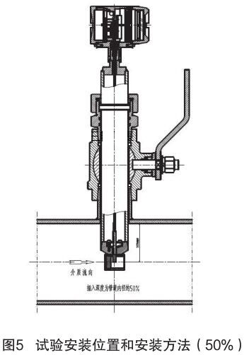 對插入式壓縮空氣流量計和插入式電磁流量計的結(jié)構(gòu)原理進行分析,插入式電磁流量計的信號采集點在標校管道內(nèi)12.5% 為宜,因它屬電磁類流量計,而壓縮空氣流量計是根據(jù)“卡門渦街”原理進行測量管道內(nèi)流量,根據(jù)標校管道內(nèi)層流和湍流的分析,以及插入式壓縮空氣流量計獨特的探頭結(jié)構(gòu)形式,確定插入式壓縮空氣流量計的插入深度為標校管道內(nèi) 50%,試驗安裝位置和安裝方法如圖 5 所示。