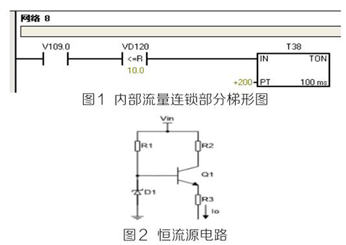 (2)PLC及模塊。PLC及模塊是自動(dòng)化控制系統(tǒng)主要設(shè)備,且PLC及模塊屬于高集成高精密電子設(shè)備,保持室內(nèi)整潔舒適,可以提高自動(dòng)化系統(tǒng)運(yùn)行穩(wěn)定性。PLC及模塊硬件運(yùn)行可靠,內(nèi)部控制程序是其控制核心軟件,如PLC硬件出現(xiàn)故障或損壞一般直接更換,但原內(nèi)部控制軟件無法上傳,整個(gè)控制系統(tǒng)成失控狀態(tài)。所以其內(nèi)部控制程序在調(diào)試驗(yàn)收合格后應(yīng)及時(shí)備份并做好標(biāo)記,為以后修復(fù)PLC故障提供保障。PLC系統(tǒng)的維護(hù)技術(shù)人員需掌握一定基礎(chǔ)PLC控制邏輯原理,對(duì)準(zhǔn)確判斷PLC故障點(diǎn)有很大的幫助。例如選礦廠水泵房S7-200系列PLC自動(dòng)抽水系統(tǒng)出現(xiàn)如下故障 :觸摸屏能控制變頻器啟動(dòng)水泵抽水,但在短時(shí)間內(nèi)會(huì)自動(dòng)停泵,導(dǎo)致無法正常抽水。通過故障現(xiàn)象可初步判斷PLC及模塊硬件設(shè)備正常,主要由于某個(gè)變量有問題導(dǎo)致連鎖停機(jī)。打開備份PLC控制梯形圖程序進(jìn)行相關(guān)分析,原來是高溫液體流量計(jì)瞬時(shí)流量數(shù)值做了連鎖,其在一定時(shí)間內(nèi)瞬時(shí)流量不大于10m 3 /h時(shí),自動(dòng)停泵,電磁流量模擬量輸出電流值僅為4ma且無變化,確定高溫液體流量計(jì)有故障。可臨時(shí)應(yīng)急維修,模擬量模塊輸入模擬電流值10ma~20ma之間一固定數(shù)值即可恢復(fù)正常運(yùn)行。制作簡(jiǎn)單恒流源電路代替高溫液體流量計(jì)輸出的模擬電流量,實(shí)現(xiàn)解決水泵無法正常運(yùn)行的故障。