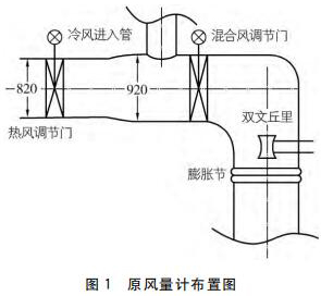 從流量測(cè)量角度講,影響流場(chǎng)的主要為熱風(fēng)調(diào)門、擴(kuò)管、彎頭以及一次冷風(fēng)的混入,閘板門和混合風(fēng)調(diào)門由于運(yùn)行時(shí)處于全開狀態(tài),影響可忽略,目前使用了單點(diǎn)雙文丘里管的測(cè)量方式,有以下問(wèn)題: