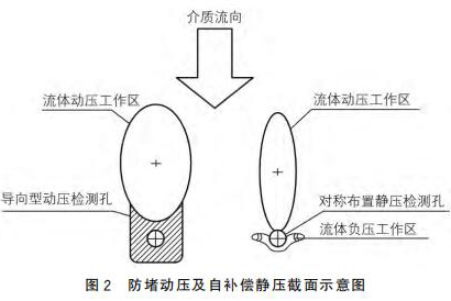 新二氧化氯流量計(jì)采用拋物面導(dǎo)向型結(jié)構(gòu)作為動(dòng)壓測(cè)點(diǎn),采用對(duì)稱自補(bǔ)償型式的靜壓測(cè)點(diǎn),可以有效地解決來(lái)流方向偏流時(shí)信號(hào)的穩(wěn)定采集,來(lái)流偏離管道軸線時(shí),可以維持輸出差壓基本不變,如圖2所示。