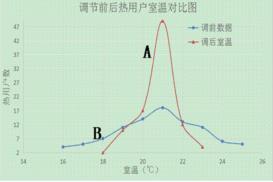 圖3中的曲線 A和B供熱管網(wǎng)智能蒸汽流量計調(diào)節(jié)前后的熱用戶室溫變化情況,橫坐標表示室溫分布,縱坐標表示熱用戶數(shù)量。從圖中可以看出,智能蒸汽流量計調(diào)節(jié)前熱用戶室溫比較分散,既有室溫小于18℃的熱用戶,也有室溫大于24℃的熱用戶。熱用戶室溫“近熱遠冷”,供熱管網(wǎng)存在水力不平衡現(xiàn)象。智能蒸汽流量計調(diào)節(jié)后,有49戶用戶室溫在20℃~21℃之間,從圖中可以看出室溫分布范圍縮小,平均室溫降低,從而,不僅減少了供熱量,也大大提高了供熱品質(zhì)。一般來講,對采暖系統(tǒng),每增加 1℃平均室溫,能耗增多 5%~10%。采暖系統(tǒng)實現(xiàn)平衡后,常??梢越档推骄覝?℃~3℃。