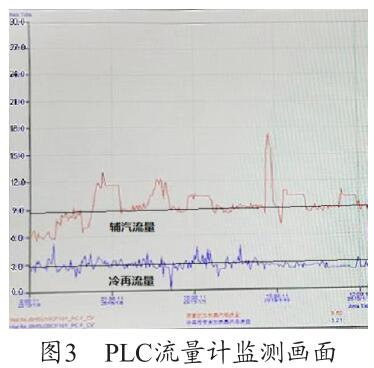 通過圖3 PLC 流量計(jì)監(jiān)測畫面可以看出,PLC 上輔汽測量用的氣體流量計(jì)的量程設(shè)置為30t/h,現(xiàn)場設(shè)備量程實(shí)際為6t/h,兩者嚴(yán)重不符,因此測量值4t/h 為錯(cuò)誤值(單臺(tái)機(jī)組運(yùn)行),需要對程序進(jìn)行修改。