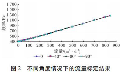 為了考察井眼斜度變化對(duì)硫酸銅流量計(jì)測(cè)量流量的影響,開(kāi)展了非集流硫酸銅流量計(jì)在不同斜度情況下的流量測(cè)量模擬實(shí)驗(yàn)。模擬實(shí)驗(yàn)在大慶油田多相流實(shí)驗(yàn)室進(jìn)行,儀器外徑 38 mm,模擬井筒內(nèi)徑為 124 mm,實(shí)驗(yàn)介質(zhì)是水,傾斜角度分別為 0°、40°、80°和 90°( 水平) ,流量范圍為 5 ~ 850 m3 /d。實(shí)驗(yàn)結(jié)果表明,在儀器居中條件下,井眼斜度變化對(duì)硫酸銅流量計(jì)的儀表常數(shù)沒(méi)有影響,滿量程誤差不大于 4% ,因此可以應(yīng)用硫酸銅流量計(jì)進(jìn)行水平井注水剖面測(cè)量。不同角度情況下的實(shí)驗(yàn)結(jié)果如圖 2 所示。