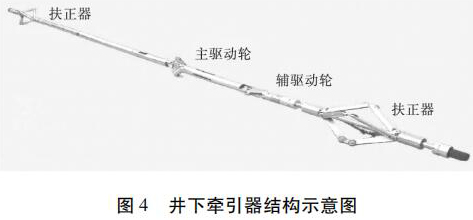 牽引器采用的是 Sondex 公司的牽引器,如圖 4所示。儀器外徑 54 mm,長(zhǎng)度 7.4 m,牽引力 273 kg,耐壓103 MPa,耐溫 150 ℃,牽引速度 540 m/h。牽引器連接于電纜頭和測(cè)井儀器之間。在水平段和造斜段儀器不能靠自重下放,利用牽引器可以將儀器推送到測(cè)井目的層段。井下?tīng)恳饔蓛山M呈 90°交叉分布的驅(qū)動(dòng)臂和扶正器組成。在進(jìn)行井下儀器牽引時(shí),*先打開(kāi)牽引器驅(qū)動(dòng)臂,使驅(qū)動(dòng)臂端部的驅(qū)動(dòng)輪支撐到套管壁并保持足夠的正壓力,然后驅(qū)動(dòng)輪旋轉(zhuǎn)實(shí)現(xiàn)對(duì)儀器的推送。井下儀器牽引過(guò)程可在地面進(jìn)行人工控制,通過(guò)控制命令和調(diào)整供電電壓可控制井下?tīng)恳俣群头较颉T摖恳魈峁┝硕喾N井下測(cè)量參數(shù),包括電纜頭電壓和張力、牽引速度、接箍深度等數(shù)據(jù),所有這些沿井身測(cè)量到的參數(shù)均可在地面顯示出來(lái),使施工具有安全性和可操作性。當(dāng)斷開(kāi)電源時(shí),驅(qū)動(dòng)臂在外力作用下可收回,保證儀器安全取出。