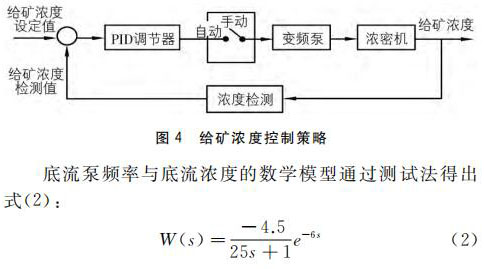 給礦濃度控制策略采用常規(guī)的PID調(diào)節(jié)器實現(xiàn),如圖4所示。在該控制系統(tǒng)中,給礦濃度設(shè)定值以及反饋的給礦濃度檢測值為PID調(diào)節(jié)器的輸 入,PID 調(diào)節(jié)器的輸出為變頻泵的頻率。該頻率可進行自動與手動兩種控制模式。以變頻控制方式對濃密機的底流泵進行精密轉(zhuǎn)速控制,即可控制濃密機排出的底流礦漿的濃度。