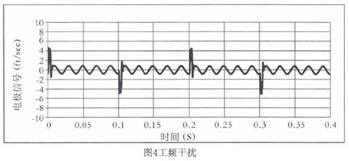 工頻干擾是高溫電磁流量計常見的干擾源。當流量計處于電源形成電磁場中時,由于分布電容的存在,以電磁波的輻射形式干擾電*信號,或者是由供電電源引入的工頻串擾,工作現(xiàn)場的工頻共模干擾,其產(chǎn)生的物理機理均是電磁感應(yīng)原理。幅度與流量信號相比,往往要大幾個數(shù)量級,頻率與供電電源頻率相同。如圖4所示,線圈驅(qū)動頻率為5Hz的電*信號,被耦合了50Hz的工頻干擾,幅度大概相當于1feet/s。