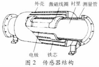 液體流量計由流量傳感器和轉(zhuǎn)換器兩部分組成。傳感器典型結(jié)構(gòu)示意如圖2,測量管上下裝有激磁線圈,通激磁電流后產(chǎn)生磁場穿過測量管,一對電*裝在測量管內(nèi)壁與液體相接觸,引出感應(yīng)電勢,送到轉(zhuǎn)換器。激磁電流則由轉(zhuǎn)換器提供。