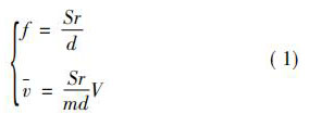 式中: 珋v 為旋渦發(fā)生體兩側(cè)平均流速,m / s; d 為旋渦發(fā)生體特征寬度,m; Sr 為斯特勞哈爾常數(shù),無量綱常數(shù); V 為管道流體平均流速,m / s; m 為旋渦發(fā)生體兩側(cè)弓形面積與管道截面積之比。 如,對(duì)于寬度為 d 的三角柱,有: