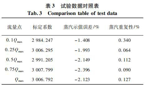 測(cè)試對(duì)象為同一臺(tái)表,DN80 口徑,帶有在空氣標(biāo)定裝置上的 5 點(diǎn)標(biāo)定系數(shù)。將管道介質(zhì)設(shè)定為過熱蒸汽,并預(yù)設(shè)溫度為 160 ℃ 和壓力 0. 4 MPa,以便儀表計(jì)算過熱蒸汽的密度。試驗(yàn)數(shù)據(jù)對(duì)照如表 3 所示。