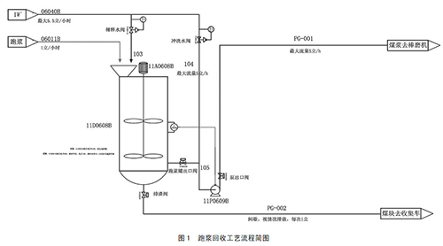 通過以上煤漿提濃通用方法優(yōu)缺點比較可以了解到,在現(xiàn)有設(shè)計條件基礎(chǔ)上,煤漿濃度提升會帶來一定設(shè)備損耗及能源損耗。針對這種情況,為了達(dá)到節(jié)能而保證實驗室氣體流量計不跑漿,對于磨機(jī)跑漿問題進(jìn)行改善,對跑漿進(jìn)行回收,重新送回磨煤機(jī)進(jìn)行二次研磨,降低了實驗室氣體流量計入口原料煤的粒度;同時降低了人員勞動強(qiáng)度,改善了現(xiàn)場衛(wèi)生情況。具體跑漿回收裝置設(shè)計流程如圖 1 所示。
