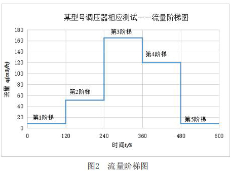 該測(cè)試主要利用實(shí)驗(yàn)室測(cè)試條件,模擬客戶現(xiàn)場(chǎng)使用情況。其主要測(cè)試內(nèi)容包括:測(cè)試電磁流量計(jì)在+23℃,-30℃和-40℃三種溫度下,電磁流量計(jì)出口壓力分別在2.1kPa和30kPa時(shí),流量分別從*1階梯到*5階梯時(shí)的響應(yīng)速度,客戶所提供的流量階梯如圖2所示。橫軸表示下游球閥開(kāi)啟動(dòng)作時(shí)間,縱軸表示衛(wèi)生級(jí)電磁流量計(jì)下游需要的流量q。