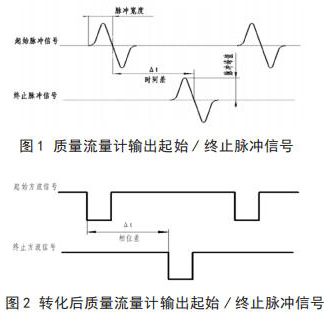 將智能型電磁流量計流量與相關(guān)測試設(shè)備連接起來,就可以進(jìn)行智能型電磁流量計的校準(zhǔn),時間差△ t 由專用試驗測試設(shè)備可以測出。起始脈沖信號和終止脈沖信號如圖 1 所示。經(jīng)過專用試驗測試設(shè)備信號轉(zhuǎn)化后的信號方波如圖 2 所示。