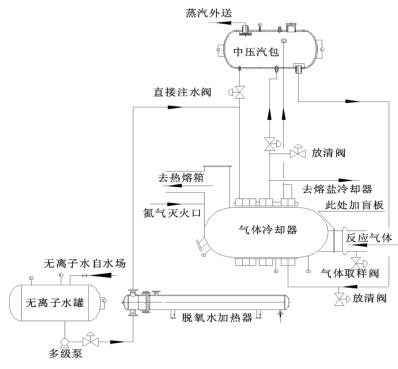 來自無離子水罐的脫氧水經(jīng)多經(jīng)泵加壓、經(jīng)脫氧水加熱器加熱后進(jìn)入到液體渦街流量計的水段,脫氧水與反應(yīng)氣體換熱后分兩路:一路進(jìn)入中壓汽包,保證汽包有穩(wěn)定的液位;一路進(jìn)入熔鹽冷卻器帶出熔鹽攜帶的反應(yīng)熱。來自中壓汽包的高溫水經(jīng)管路接至液體渦街流量計汽段底部,高溫水與反應(yīng)氣體換熱后產(chǎn)生高壓蒸汽,高壓蒸汽又返回中壓汽包。汽包還有一路直接注水管路,此路水不經(jīng)過液體渦街流量計水段,而是直接進(jìn)入汽包。在液體渦街流量計出口溫度偏低而汽包液位也比較低時,可開此直接注水管路來穩(wěn)定汽包液位。其詳細(xì)流程圖如圖 2。