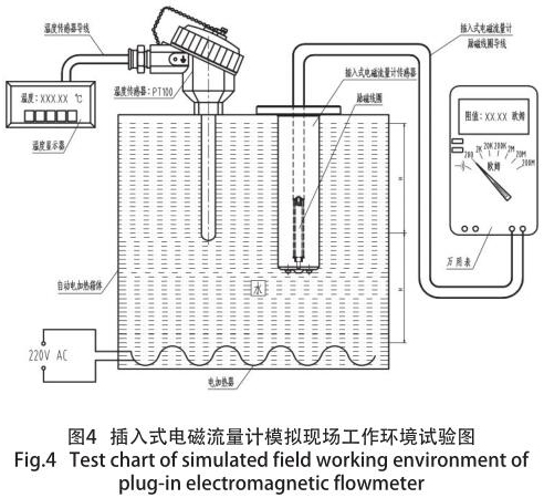 其原因是:勵(lì)磁線圈的阻值及匝數(shù)是按照常溫狀態(tài)下進(jìn)行設(shè)計(jì)的,而含有勵(lì)磁線圈的測(cè)水流量計(jì)經(jīng)常是高于常溫狀態(tài)下進(jìn)行安裝、使用(如:高爐回水、供熱管道等),勵(lì)磁線圈的阻值隨使用環(huán)境溫度的變化而變化,致使測(cè)水流量計(jì)測(cè)量時(shí)的準(zhǔn)確度大為降低,性能的不確定性大為增加,為了保證儀表的高準(zhǔn)確度和穩(wěn)定性,在不同的季節(jié)(主要是環(huán)境溫度和介質(zhì)溫度),經(jīng)過(guò)大量模擬現(xiàn)場(chǎng)實(shí)際情況的試驗(yàn),并結(jié)合轉(zhuǎn)換器的技術(shù)參數(shù)要求,得出一個(gè)完善的勵(lì)磁線圈各種技術(shù)參數(shù)。模擬現(xiàn)場(chǎng)試驗(yàn)裝置如圖 4 所示。