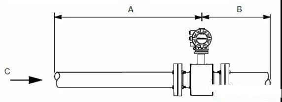 為了確保過程條件大幅度變化的情況下的規(guī)定精度,安裝傳感器時,在電*平面上游留出至少五倍管徑長度的直管段,在電*平面下游留出至少兩倍管徑長度的直管段。
