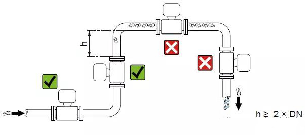 在豎直向下管道中安裝時(shí)(h ≥ 5 m (16.4 ft)),需要在傳感器的下游管道中安裝帶泄放閥的虹吸管, 避免出現(xiàn)低壓,以及抽壓時(shí)損壞測(cè)量管。此措施還可以防止系統(tǒng)的測(cè)量精度降低。