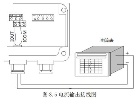 使用電流輸出線(4-20mA)時,應(yīng)注意到導(dǎo)線的電阻與負(fù)載電阻之和不得大于 750Ω 。電流輸出接線見圖 3.5。