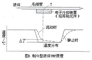 液體用tmf 在20世紀90年代初中期開始發(fā)展并在工業(yè)生產(chǎn)中應(yīng)用,但當(dāng)前主要為微小流量儀表。有消耗功率測量法的熱分布式tmf和利用珀爾帖( peltier)致冷元件在檢測部位致冷(即附加熱)的tmf。后者的測量原理如圖6所示,流量傳感器由測量毛細管、電子冷卻裝置(珀爾帖元件)和3各溫度檢出件組成。測量管和致冷元件接觸,無液體流動時冷卻到某一溫度時,兩者溫度相等;液體流動時致冷元件附近測量毛細管溫度上升,如虛線所示分布,測量溫度檢測點的兩者溫度差以求的流量。