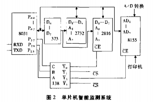 (3)單片機(jī)智能監(jiān)測系統(tǒng)該部分由8031單片機(jī)、地址鎖存器7415373、EPROM2732、E²PROM2816、并行接口8l55、地址譯碼器74LS138組成,如圖2所示: