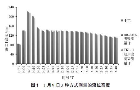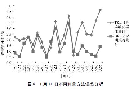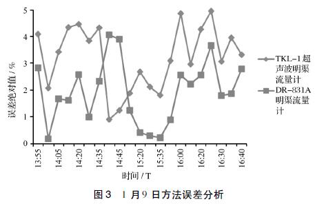 見圖3,以手工實測液位高度為基準(zhǔn),2種流量計的誤差均在±5%的范圍內(nèi)。除在1月9日14:40和14:45兩個時間點測量值表現(xiàn)出DR-831A測量誤差高于TKL-Ⅰ外,其他時段都明顯表現(xiàn)出DR-831A測量誤差小于TKL-Ⅰ。